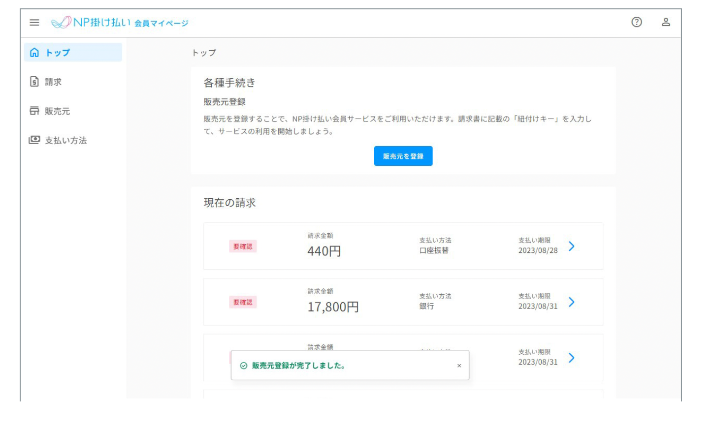 販売元の登録を行うと、自動的に振込先口座が1つにまとまり、複数の請求を まとめて振り込むことができます。