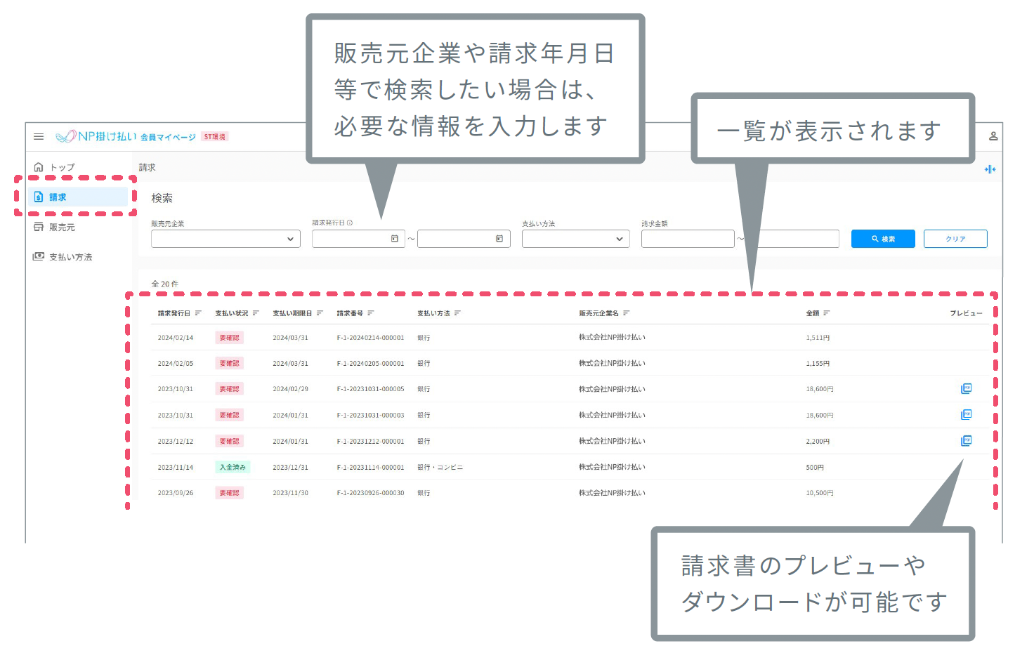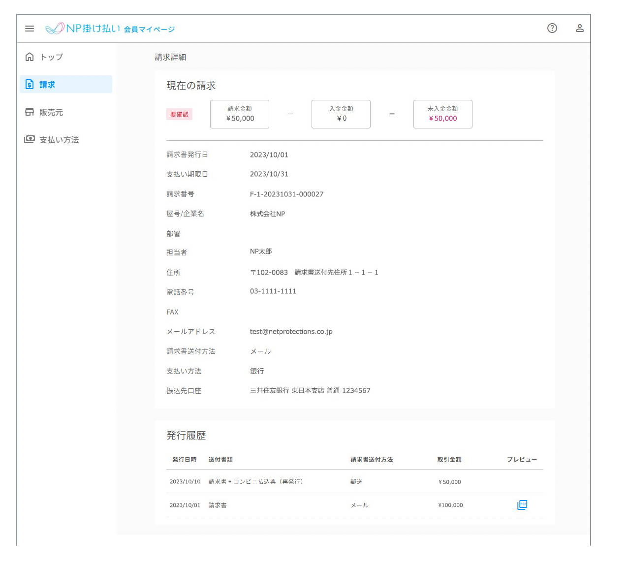 ※再発行により複数請求書が発行された際には、最新の請求書が表示されます。過去の請求書プレビューについては次ページをご確認ください。