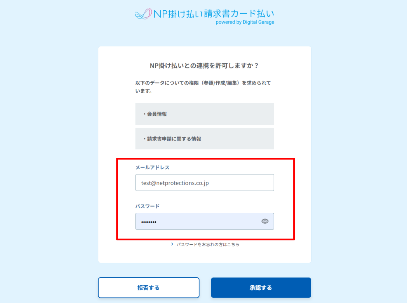 以下画面に遷移しますので、「NP掛け払い 請求書カード払い」にてご登録の情報をご入力ください。