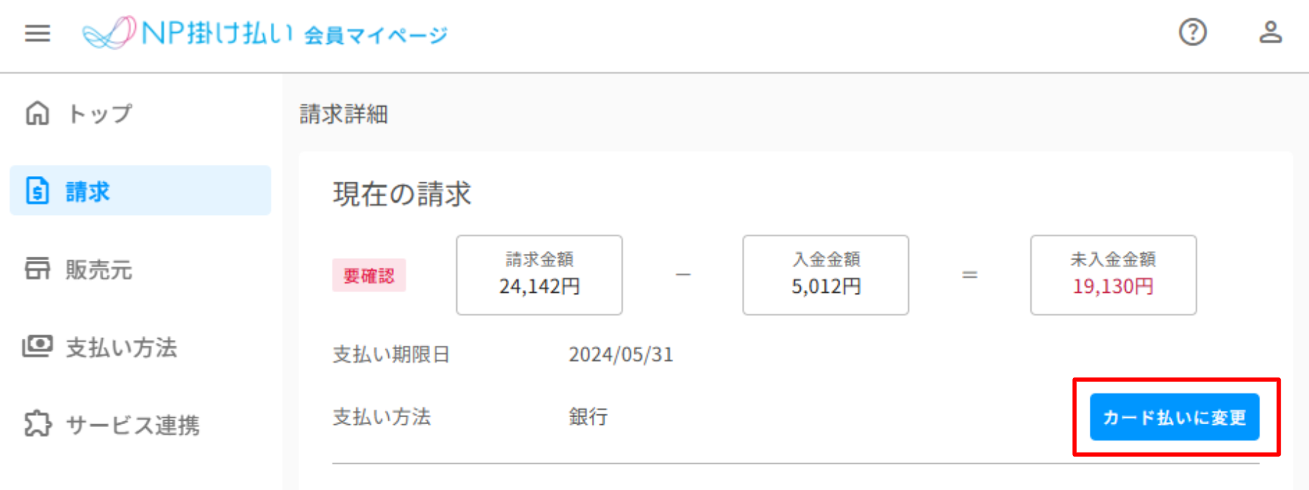 カード払いに変更したい請求を選び、「カード払いに変更」を選択